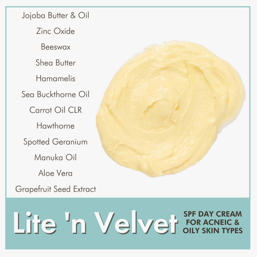 Made from pure ingredients, Lite and Velvet Acne Care is an essential for treating oily and problematic complexions. Natural waxes help to regulate sebum production, while essential oils protect against future infections and breakouts. It works to protect the skin from both infection and sun damage, while gradually reducing the signs of previous environmental damage.